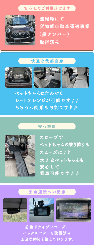 安全運転を心がけ、飼い主様とペットちゃんが安心して過ごせる時間をお届けいたします。